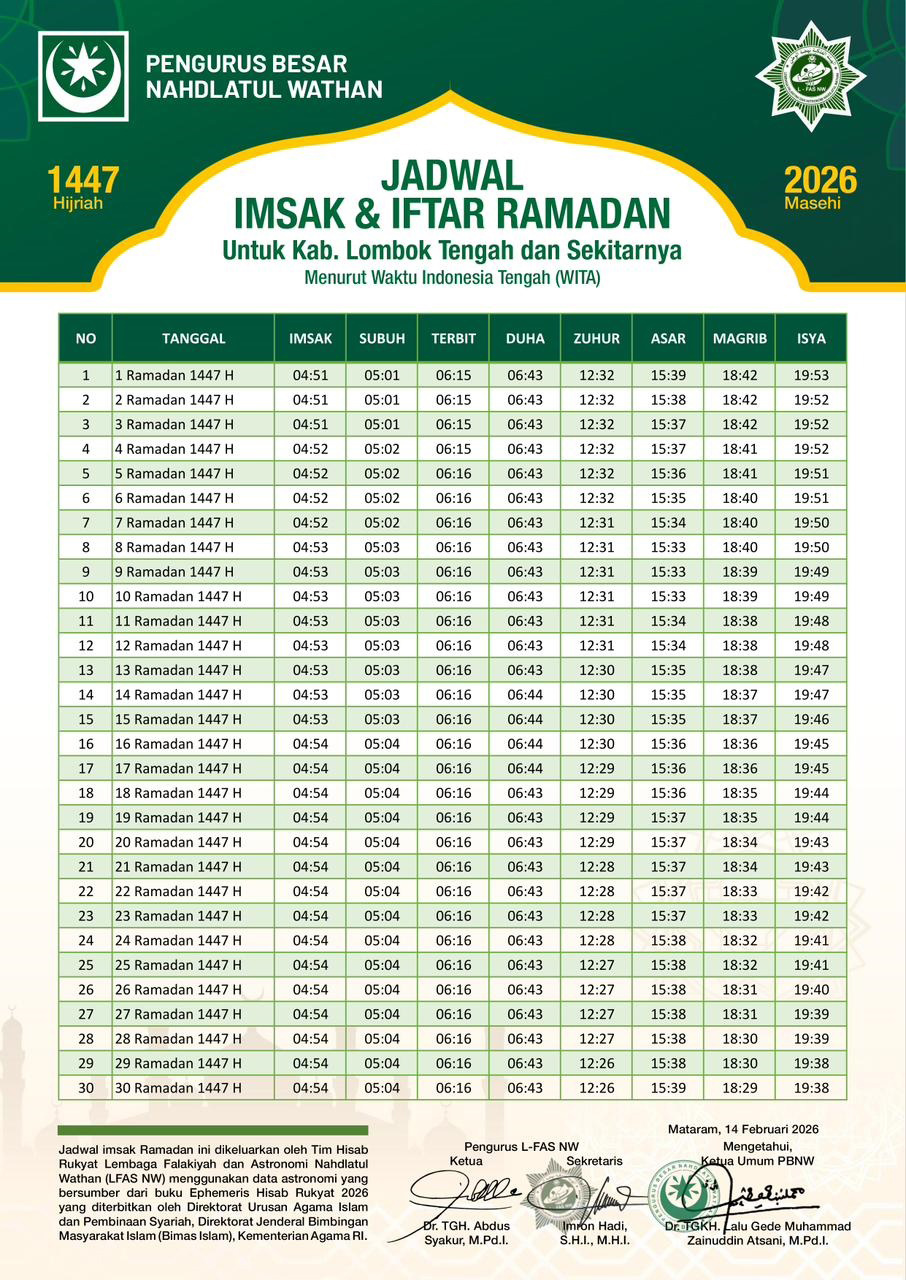 Dengan Pengumuman Resmi dari Pemerintah Republik Indonesia, bahwa tanggal 1 Ramadhan 1447 H jatuh pada Hari Kamis tanggal 19 Februari 2026, maka dengan ini Pengurus Besar Nahdlatul Wathan (PBNW) melalui Lembaga Falakiyah dan Astronomi (L-FAS) Nahdlatul Wathan, mengeluarkan jadwal imsakiyah puasa Ramadhan 1447/2026, untuk warga Kabupaten Lombok Tengah dan sekitarnya.
